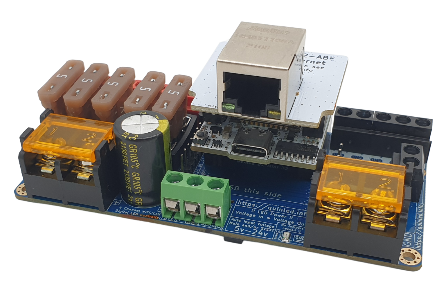 Unique features of the QuinLED-Dig-Quad are 7 positive and negative output channels on the board running through 5 fuses (Channel 1&2 and 3&4 each share a fuse) making power injection much easier with all hardware and protection on the single board instead of having to use external components.
